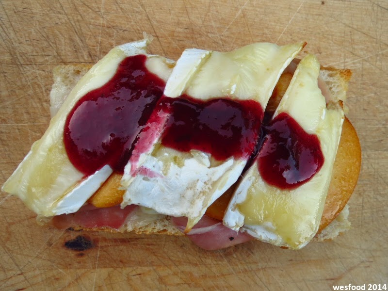 Die Baguettestücke buttern, und in dieser Reihenfolge mit Schinken, Pfirsich und Brie belegen.