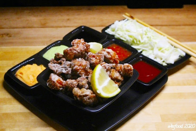 Karaage bedeutet übersetzt so viel wie "Frittieren nach fremdländischer Art" und wie fast immer, wenn in Japan von fremdländisch geredet wird, ist China gemeint. Anders. als in Japan sonst üblich, wird hier nicht Panko oder Tempurateig gearbeitet, sondern, eben wie in China, allein mit Speisestärke. Da kommen wir auch schon zum einzigen Kritikpunkt, den ich gegen das heutige Essen anzuführen habe: ich hätte die Stücke nach dem Wenden in der Stärke noch mal etwas Abklopfen müssen, um überschüssiges Mehl zu entfernen. Das hätte für eine schönere, durchgehende Bräune gesorgt, ohne diese weißen Stärkeflecken, die dem Geschmack und der Textur übrigens keinen Abbruch tun.